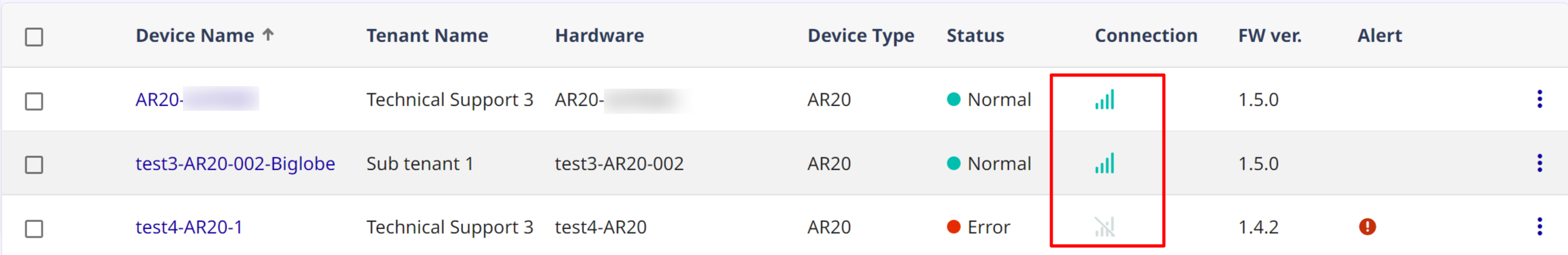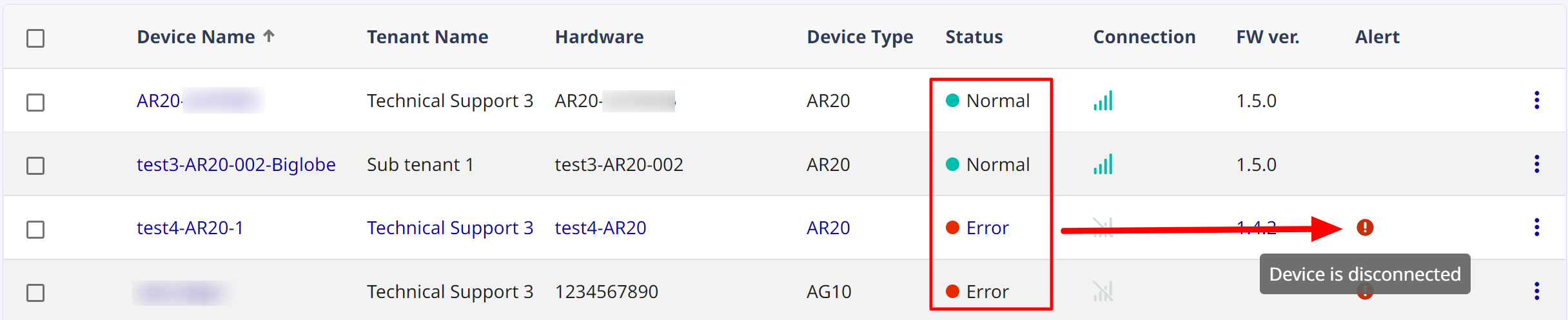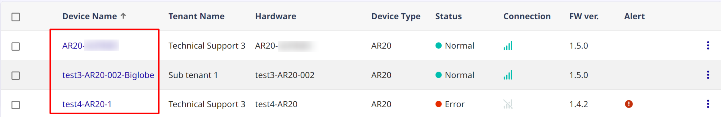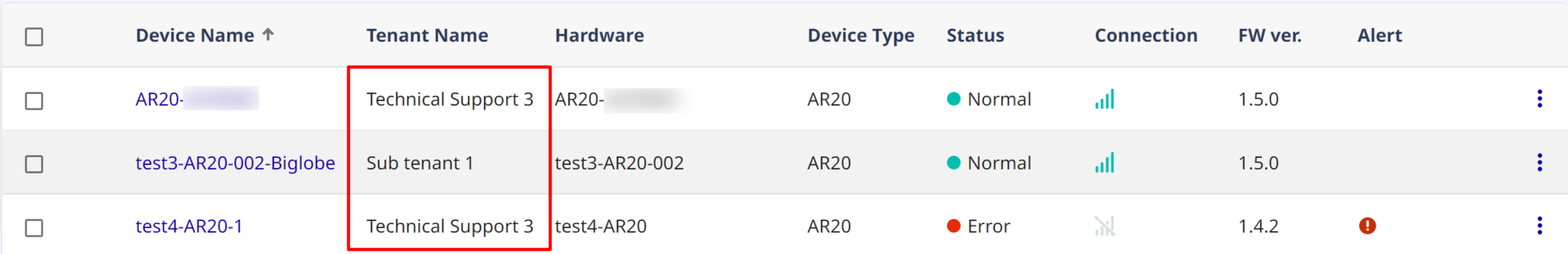 On the [ Device List ], the status of each of the devices belonging to the tenant can be listed as shown in the figure below.