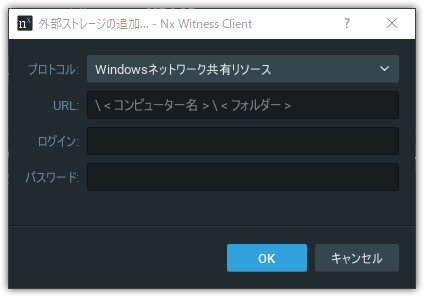 [プロトコル] メニューから目的の選択肢を選択し、外部ストレージデバイスに対して [URL](ストレージパス)、[ログイン]、および [パスワード]を入力します。