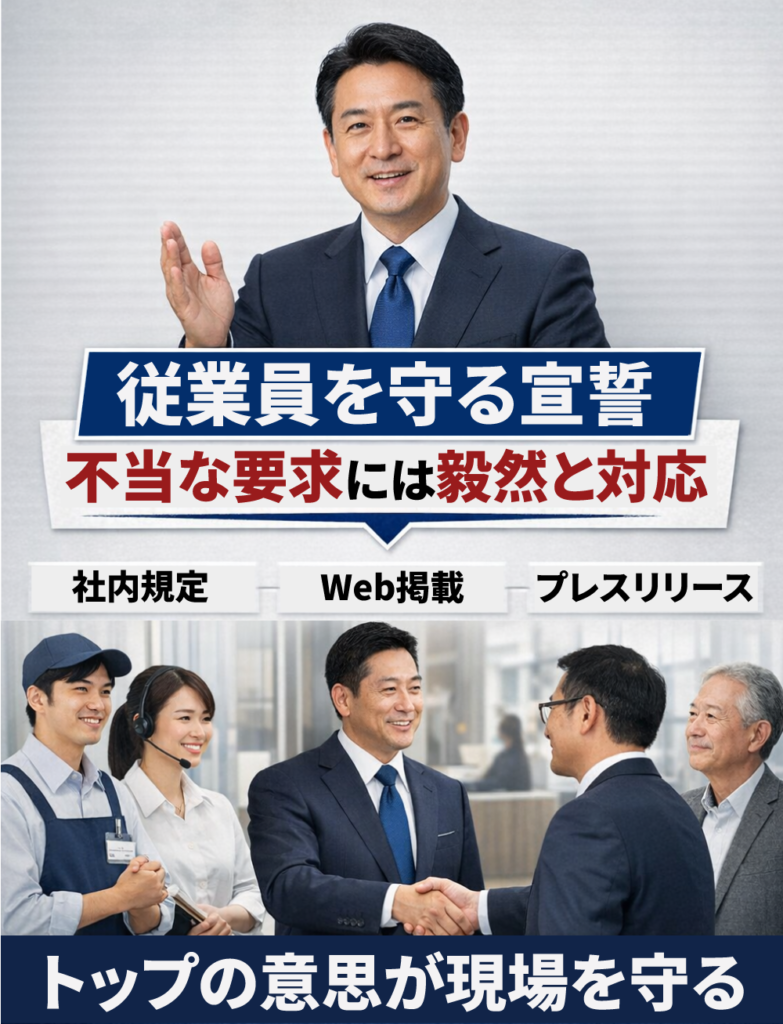 まずはカスハラに対する基本方針を明確に定め、経営トップが「従業員を守るため、不当な要求には毅然と対応する」というメッセージを発信することが重要です。これを社内規程に明記するとともに、ウェブサイトやプレスリリースで公表し、ステークホルダー全体へ周知します。