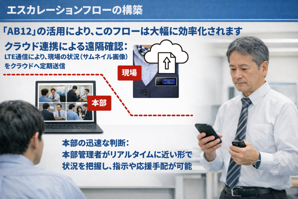 一次対応で解決しない場合の報告ルート、上司への交代タイミング、警察への通報基準を明確にします。「AB12」の活用により、このフローは大幅に効率化されます。