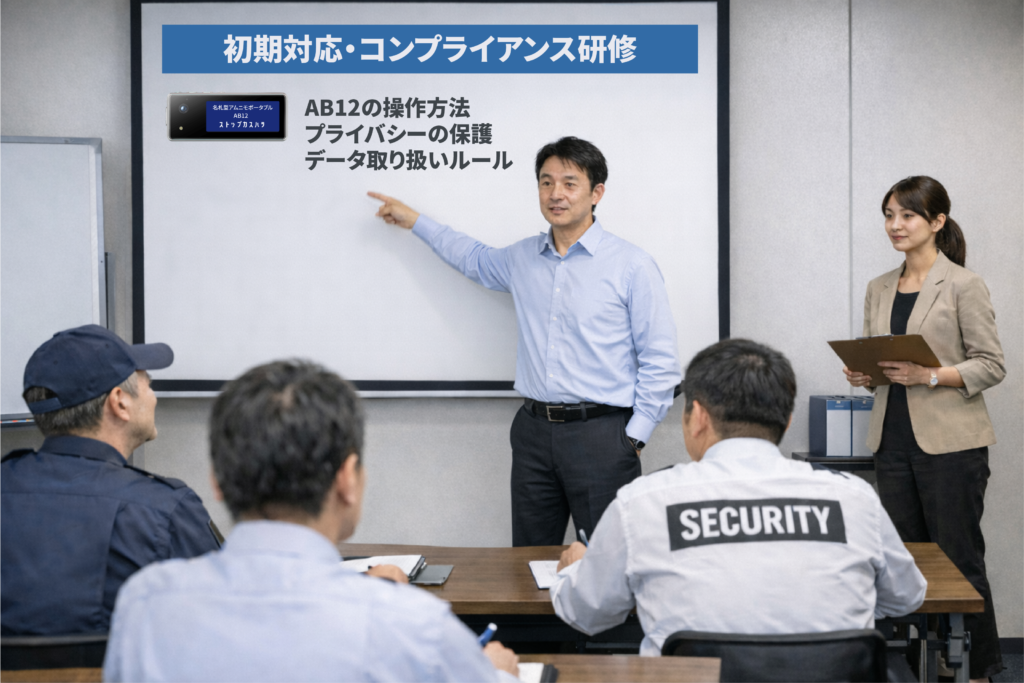 全従業員を対象に、マニュアルに基づく初期対応研修を実施します。 あわせて、カメラ操作だけでなく、プライバシー保護やデータ取り扱いに関するコンプライアンス教育も行います。