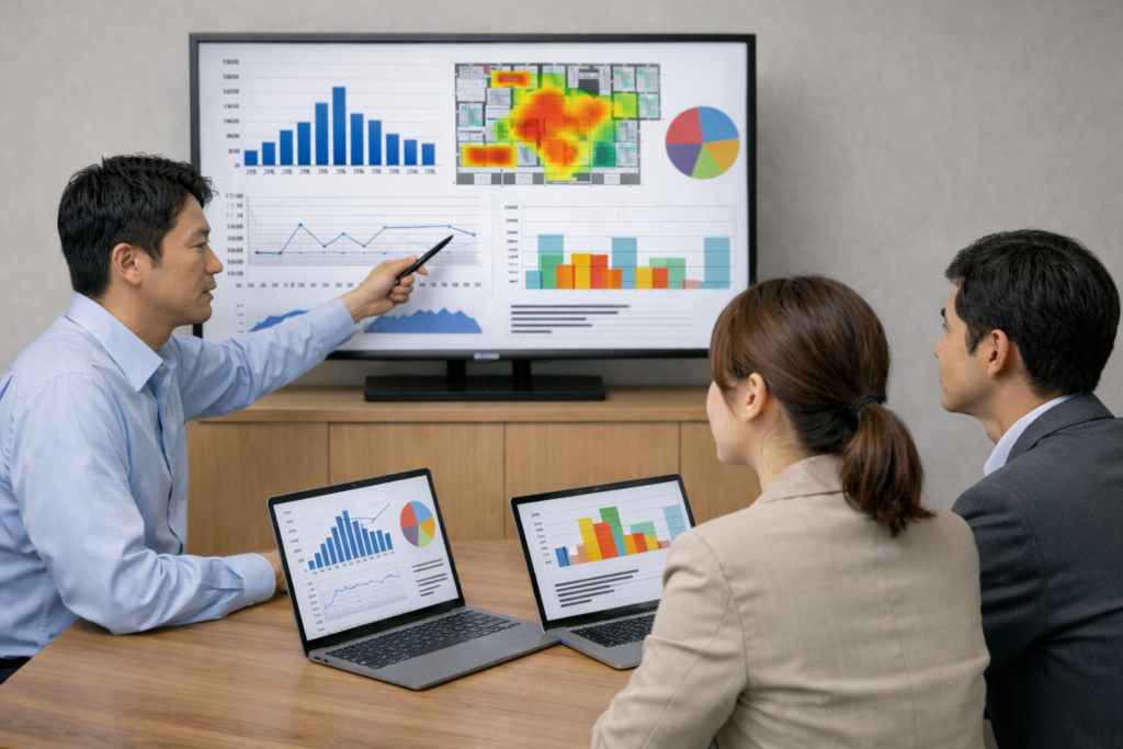 記録データを分析し、マニュアルの改善やリスクの高い時間帯・エリアを特定します。 これを研修に反映することで、組織全体の対応力を強化します。
